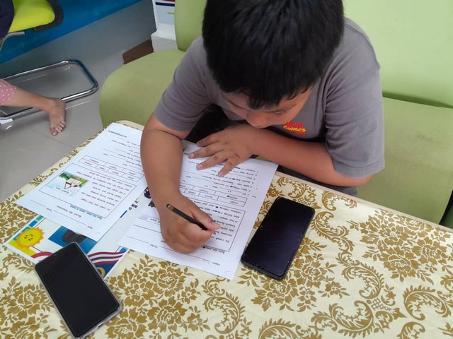 Selesainya kelas E-learning, kami teruskan pula dengan kelas Bahasa Malaysia. Kali ini, mereka juga dikehendaki untuk menjawab soalan, tetapi dalam bentuk cetakan. Terdapat empat jenis bahagian yang merangkumi Pemahaman, suku kata, kata kerja dan mengenal pasti nama objek.